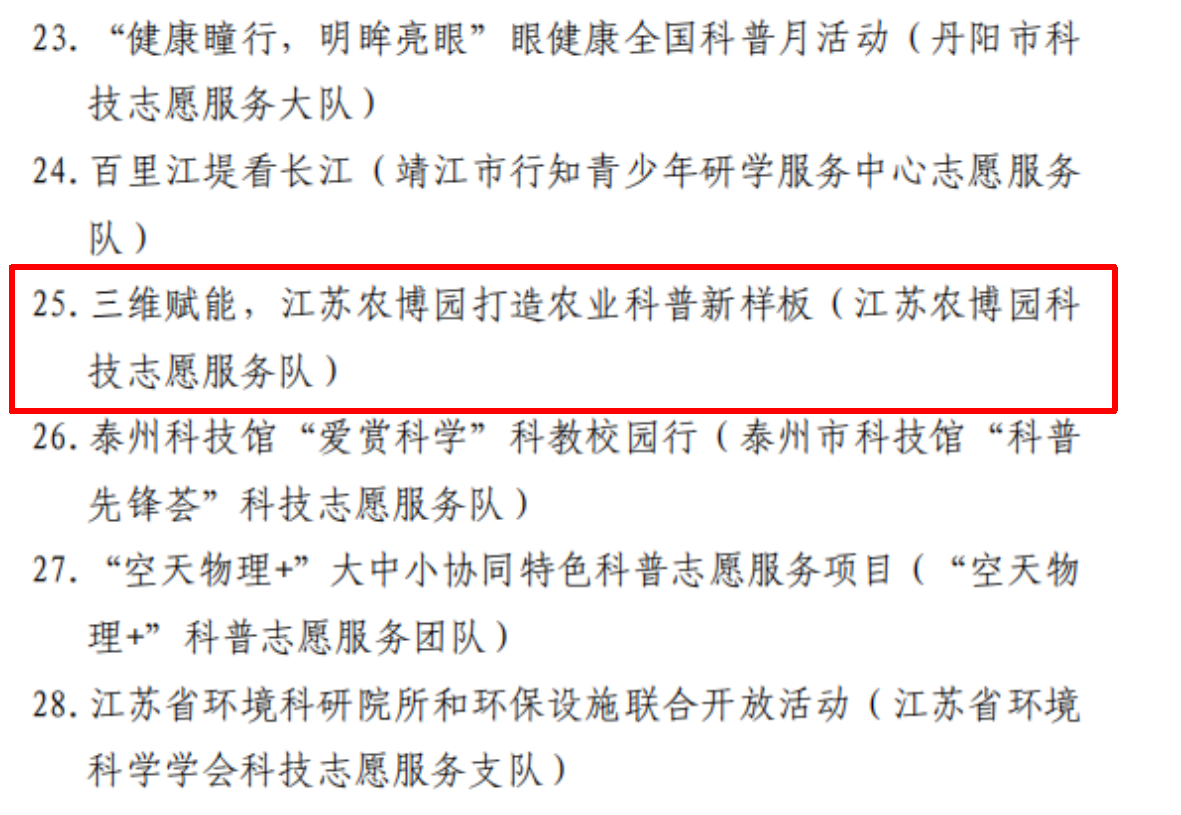 近日,长三角科技志愿服务联盟公布了2025年度长三角科技志愿服务先进典型评选结果。此次,长三角科技志愿服务联盟共评选出100名优秀科技志愿者、100个优秀科技志愿服务组织、100个优秀科技志愿服务品牌活动。江苏农博园申报的“三维赋能,江苏农博园打造农业科普新样板”获得优秀科技志愿服务品牌活动。